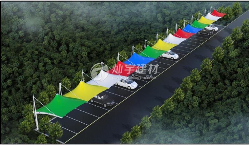 燦宇彩色膜結構車棚,還有其它顏色可選,紅黃藍綠青蘭紫迷彩色滿足不同客戶的個性需求